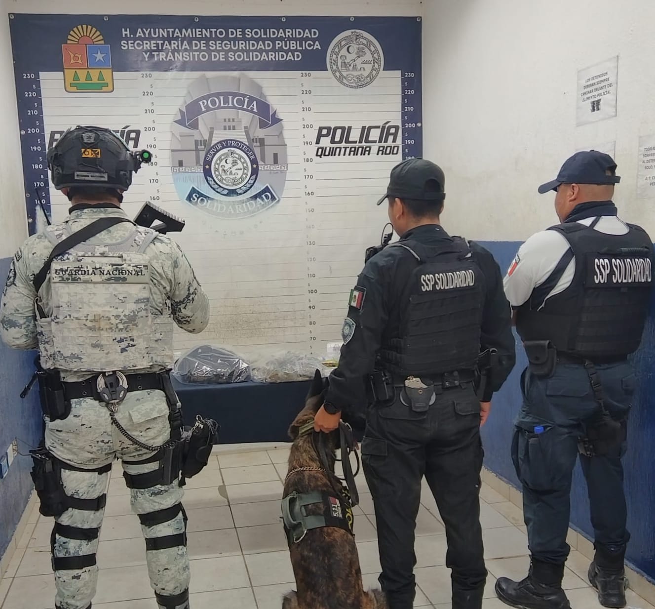 Por otra parte, la Policía Turística, la Unidad Canina y la Guardia Nacional recorrían la Quinta Avenida, cuando un oficial canino realizó un marcaje de alerta a una mochila que se encontraba aparentemente escondida por la avenida Constituyentes, ésta contenía 27 envoltorios con lo que parece ser marihuana, 56 con una sustancia similar a la cocaína, 11 con posible metanfetamina, 22 con pastillas, 8 con la droga denominada LSD, así como un envoltorio, 6 sobres y 3 recipientes con una sustancia a determinar.