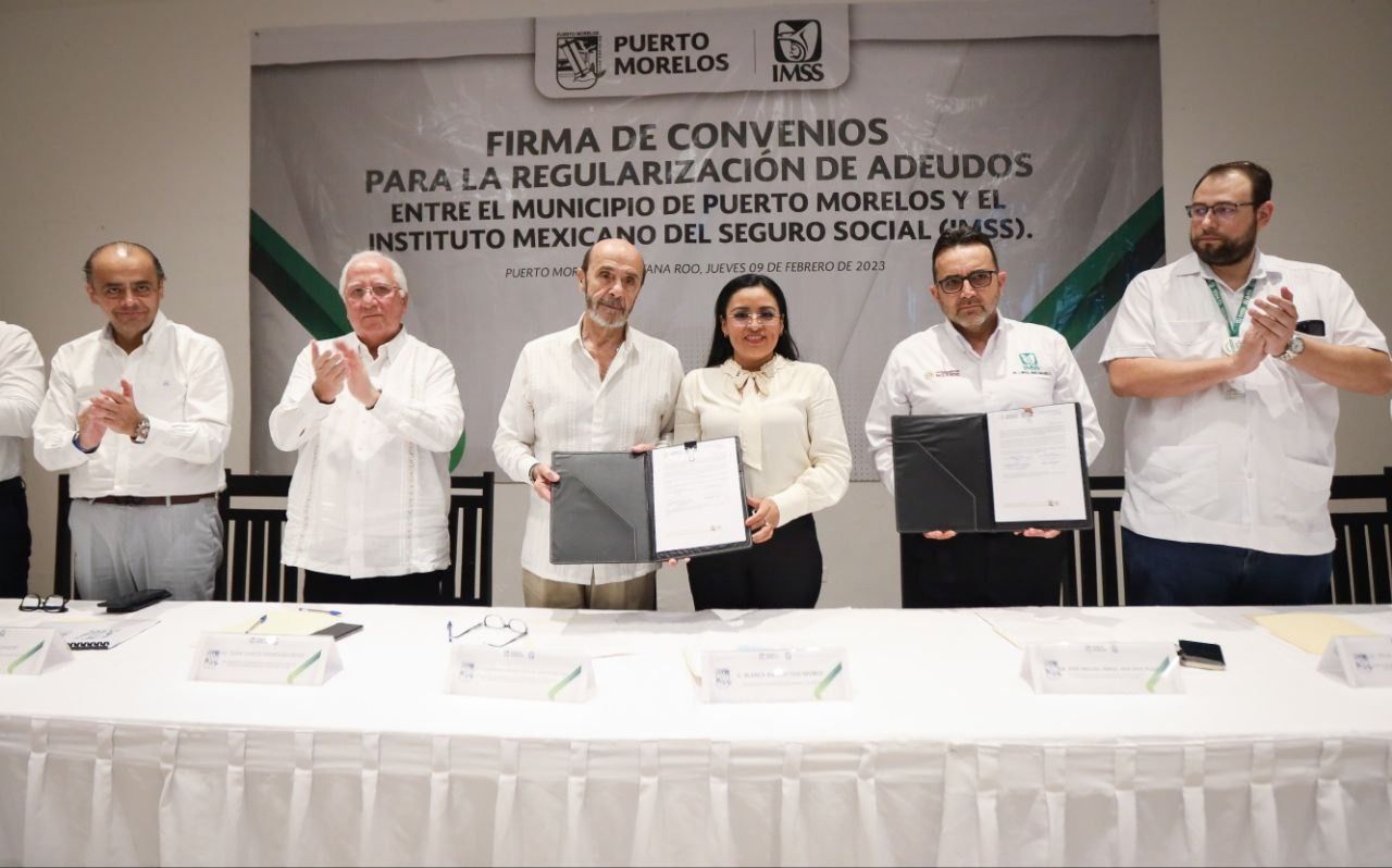 El gobierno de la alcaldesa Blanca Merari Tziu Muñoz y el Instituto Mexicano del Seguro Social (IMSS) firmaron hoy dos convenios, con los que se liquidarán 80 millones 716 mil pesos correspondientes a adeudos heredados de la anterior administración municipal, que descontó a los trabajadores del Ayuntamiento sus cuotas obrero-patronales en 2020 y 2021 pero no hizo el pago a la institución.