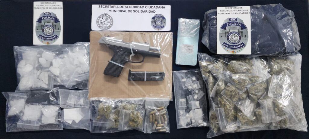 En un operativo de vigilancia, la Policía Municipal de Solidaridad aseguró a una mujer en posesión de más de 80 envoltorios de posibles narcóticos, un arma de fuego y cartuchos en el fraccionamiento Villas del Sol.