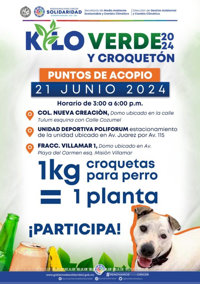 En beneficio de caninos del santuario animal y el medio ambiente, el gobierno de Solidaridad que dirige Lili Campos te invita a participar en el evento “Kilo Verde y Croquetón” el próximo 21 de junio.