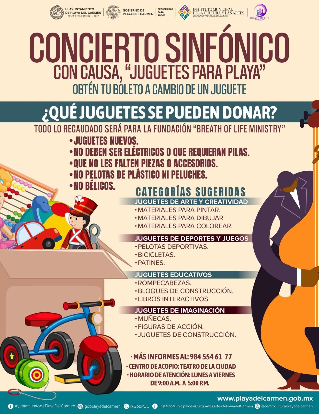 “En la agenda socio cultural de nuestra presidenta municipal Estefanía Mercado se estableció una alianza con fundaciones como “Breath of life ministry”, con más de una década en Playa del Carmen, ayudando a familias vulnerables entre las cuales hay madres solteras, así que pedimos la donación de juguetes que serán para sus hijos e hijas, y así los donantes podrán acceder a esta presentación”, informó Ernesto Santiago Martínez Cuéllar, director general del Instituto Municipal de la Cultura y las Artes.