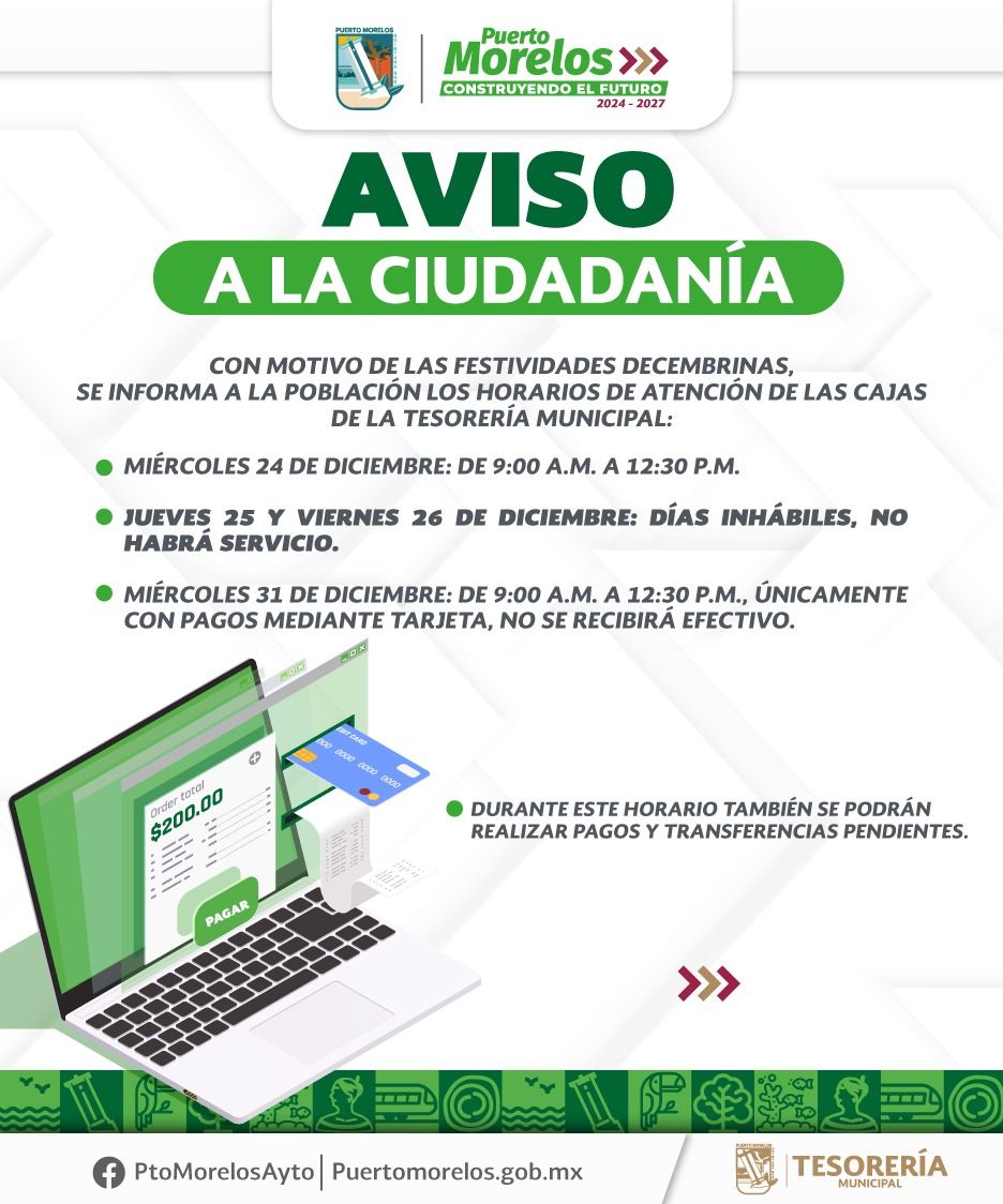 - Las cajas de la Tesorería Municipal brindarán atención los días 24 y 31 de diciembre para que las y los ciudadanos puedan cumplir con sus contribuciones