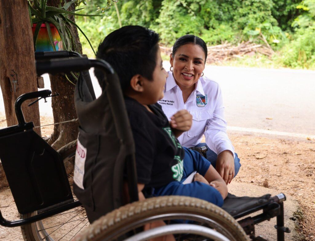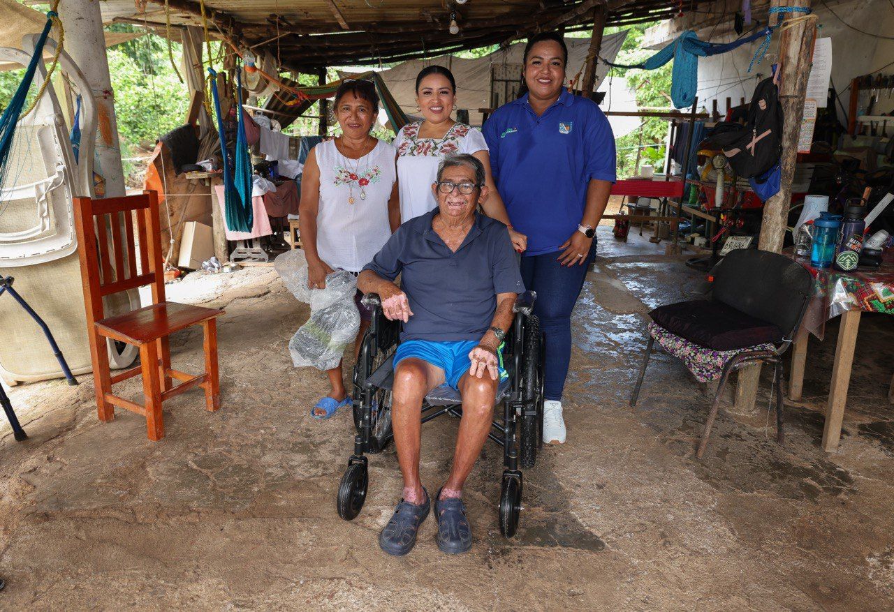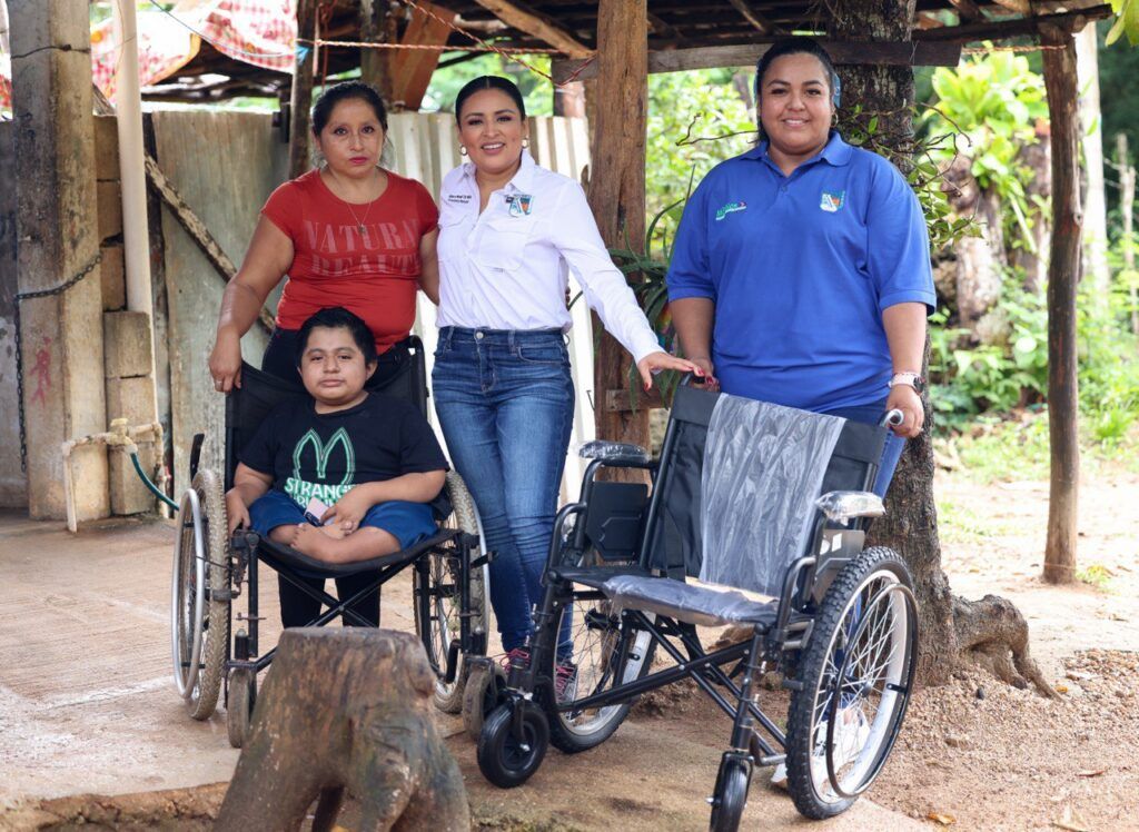En la comunidad de Leona Vicario, la presidenta municipal atendió gestiones canalizadas por la Dirección de Gestión Social, encabezada por Mara Sulema Betancourt Pech, mediante la entrega de sillas de ruedas a Daniel Fernando Jiménez, joven con osteogénesis, y don Javier Francisco Pérez, quien debido a su edad avanzada requería apoyo para su movilidad.