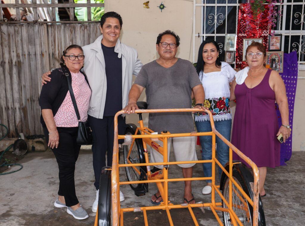 En la colonia Zetina Gasca entregó un triciclo de carga a don José Martín Araujo, para facilitar el traslado de materiales y entregas de su carpintería, contribuyendo así al fortalecimiento de su economía familiar.
