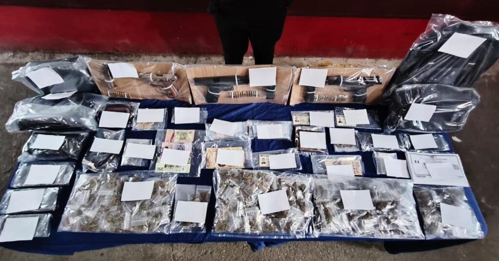 En el operativo se logró la detención de tres hombres y una mujer, a quienes se les aseguraron 268 bolsitas con vegetal verde con características similares a la marihuana, tres armas de fuego cortas calibre 9 milímetros con cargadores abastecidos, 102 mil pesos en efectivo, nueve teléfonos celulares, documentación diversa y un vehículo Jeep Grand Cherokee color negro, con placas del Estado de México.