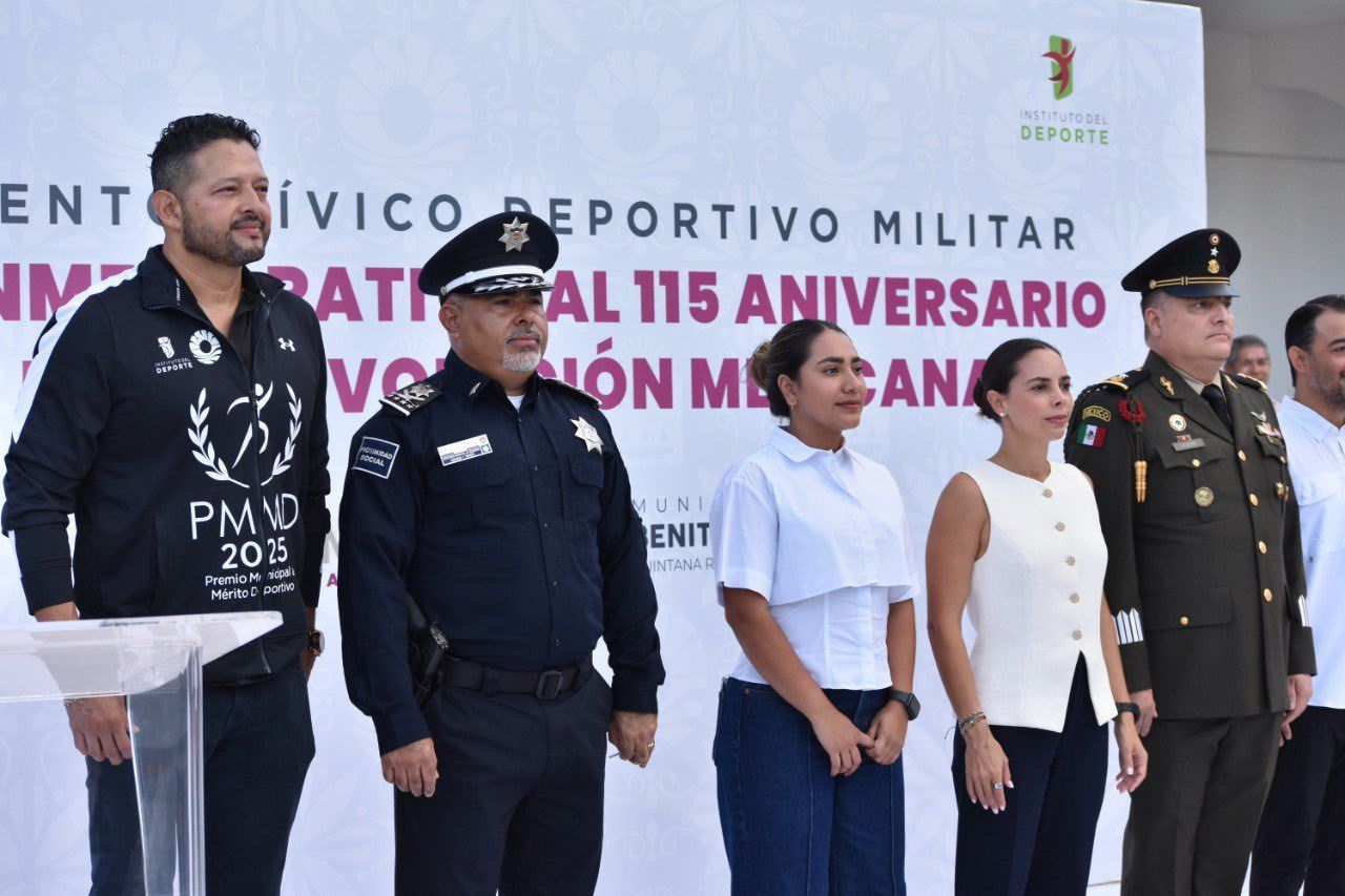 Más de mil 500 personas participaron este martes en la explanada de Plaza de la Reforma del Palacio Municipal de Cancún en un evento cívico, deportivo y militar para celebrar el 115 aniversario de la Revolución Mexicana.