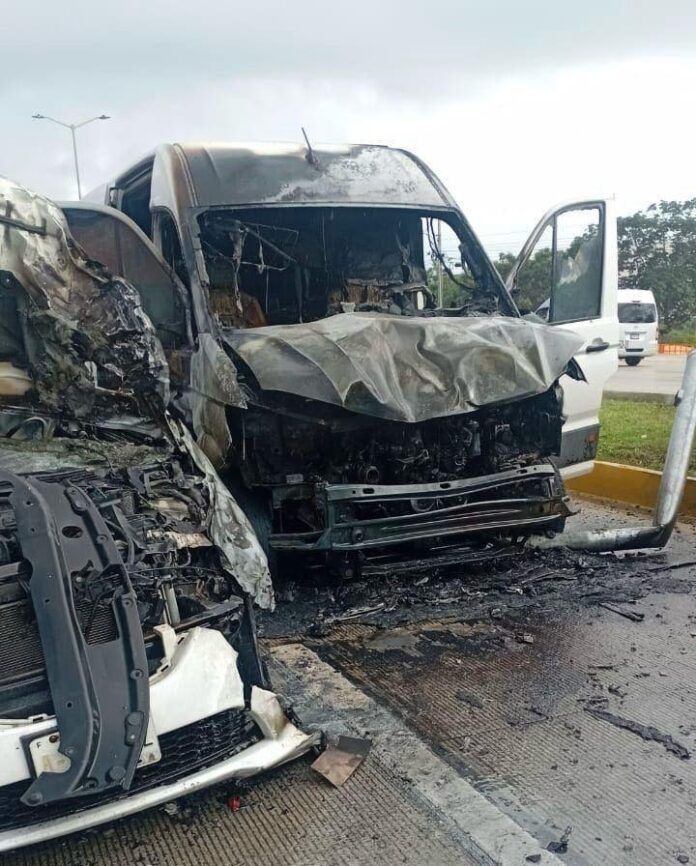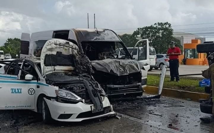 El golpe fue tan fuerte que la Urvan volcó sobre el camellón central, mientras que los otros dos vehículos comenzaron a incendiarse después del impacto. Las llamas obligaron a la intervención inmediata del Cuerpo de Bomberos de Cancún, que logró sofocar el fuego antes de que las unidades fueran consumidas por completo.