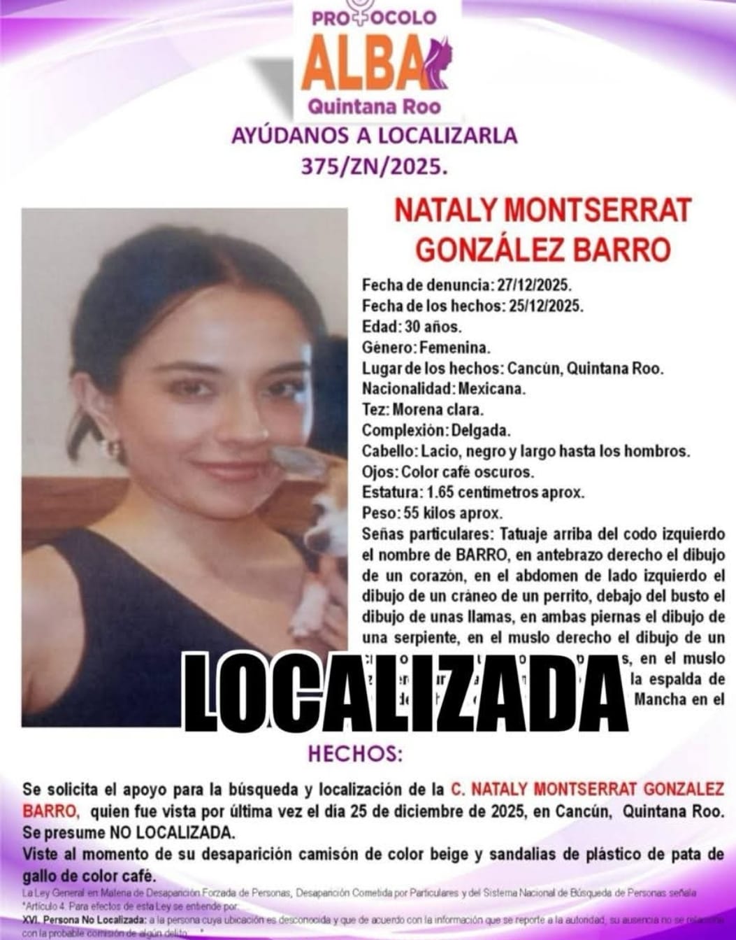 La Fiscalía General de Quintana Roo confirmó el lamentable hallazgo sin vida de Nataly Montserrat “N”, por quien esta Representación Social había emitido una ficha de búsqueda bajo el Protocolo Alba.