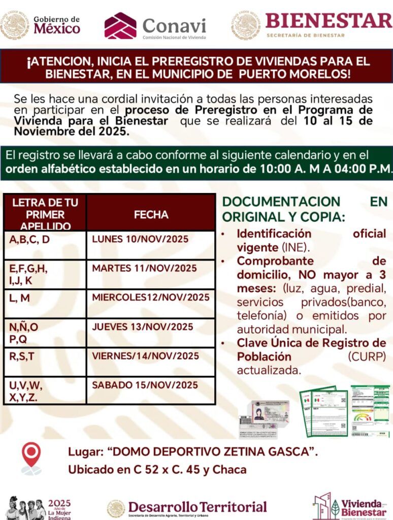 Requisitos para el registro: Ser mayor de edad; percibir entre uno y dos salarios mínimos; no contar con vivienda propia ni ser derechohabiente de Infonavit o Fovissste, ni haber recibido apoyos de vivienda anteriormente; presentar original y copia de CURP e INE; comprobante de domicilio no mayor a tres meses y ser residente de Puerto Morelos.