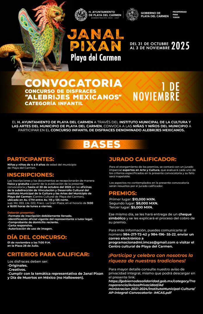 El Instituto Municipal de la Cultura y las Artes de Playa del Carmen invitó a las familias playenses a participar en los diversos concursos que se llevarán a cabo en el marco de las festividades del Janal Pixan 2025, con una bolsa en premios de casi 200 mil pesos.