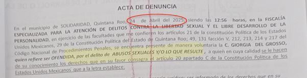 La señora Del Grosso dijo que presentó la denuncia ante la Fiscalía General del Estado de Quintana Roo en Playa del Carmen, entregando todas las pruebas con las que cuenta, colaborando con las instituciones oficiales del estado, siendo necesario practicar distintos dictámenes periciales a su hijo.