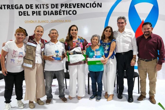 Durante un evento realizado en territorio, en el Parque del Queso, la gobernadora Mara Lezama Espinosa entregó 122 kits de prevención de pie diabético, que incluye zapato ortopédico y plantilla ortopédica, así como 157 kits de control de diabetes e hipertensión, con glucómetro digital, tiras reactivas y baumanómetro digital, en coordinación con la Beneficencia Pública.
