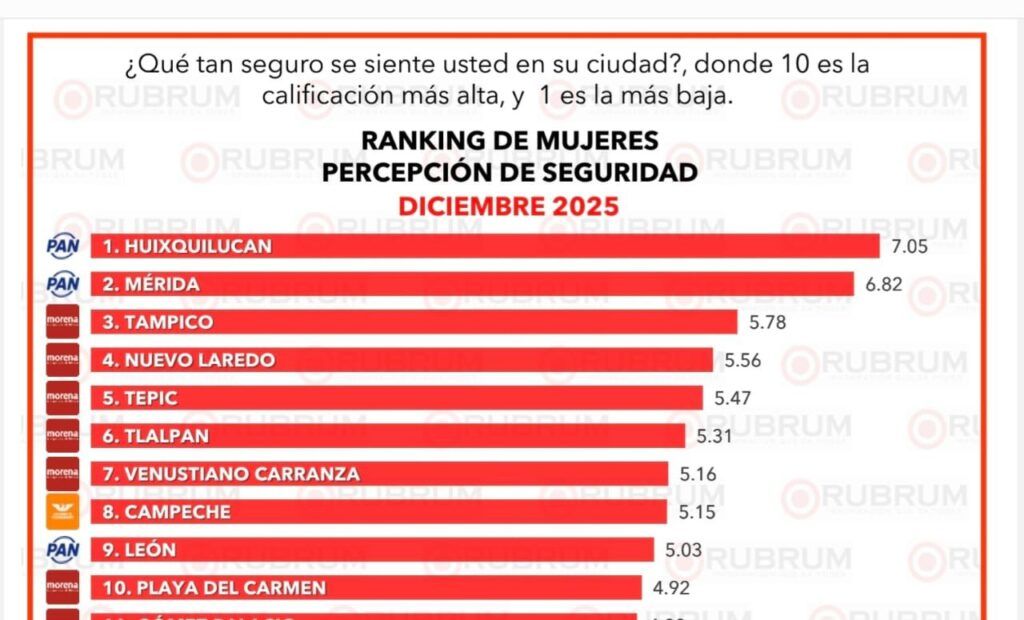El estudio Evaluación de Alcaldesas – Rubrum, diciembre 2025 confirma que Estefanía Mercado es la alcaldesa mejor evaluada de Quintana Roo, destacando especialmente por la mejora en la percepción de seguridad y por la calidad de los servicios públicos, dos de los indicadores más sensibles para la ciudadanía.