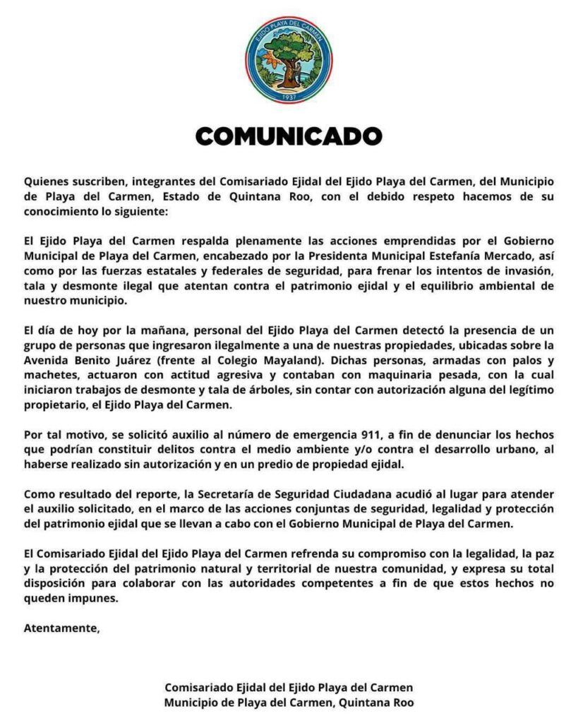 La presidenta municipal de Playa del Carmen, Estefanía Mercado, sostuvo una reunión con la Mesa Regional de Seguridad para reforzar la coordinación con las fuerzas estatales y federales ante los hechos ocurridos este día en un predio del Ejido Playa del Carmen, donde se realizaban trabajos ilegales de deforestación vinculados con intentos de invasión.