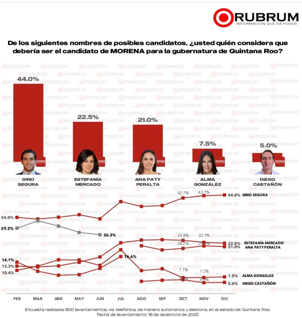 De acuerdo con la más reciente medición de la casa encuestadora Rubrum, Gino Segura y Estefanía Mercado encabezan las preferencias internas de Morena rumbo a la definición de su candidatura para la gubernatura de Quintana Roo en 2027.