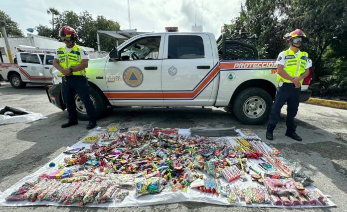 Bajo la coordinación del secretario de Protección Civil de Playa del Carmen, Darwin Covarrubias, durante el operativo más de 200 kilogramos de pirotecnia fueron asegurados en un punto donde se detectó la instalación irregular de mesas sobre la vía pública en el fraccionamiento Villas del Sol, mientras que el resto del material fue localizado y decomisado en diversos puntos de la zona comercial, como resultado del recorrido preventivo.