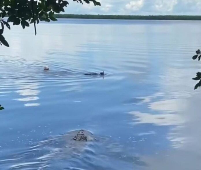 El incidente, grabado por testigos y difundido en redes sociales, muestra el momento en que un ejemplar de la especie Crocodylus acutus se abalanza sobre el bañista, quien ignoró los señalamientos que prohíben nadar en el hábitat natural de estos animales.