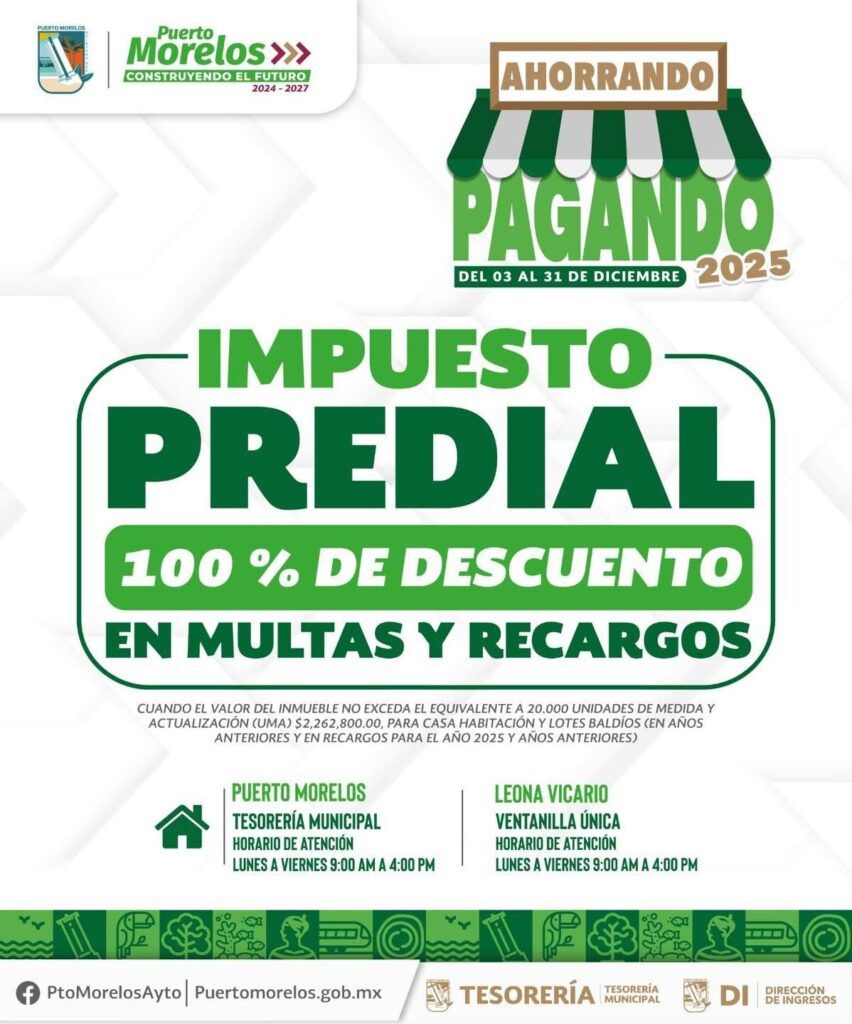 El funcionario municipal detalló los rubros que en el Impuesto Predial se aplicará 100 por ciento de descuento en recargos, siempre y cuando el valor del inmueble no exceda el equivalente a 20,000 unidades de medida y actualización (UMA) $2,262,800 para casa habitación y lotes baldíos para el año 2025 y años anteriores.