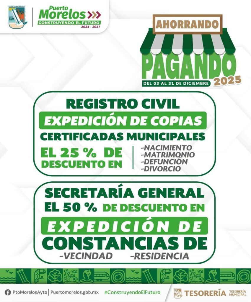 En Actas del Registro Civil de nacimiento, matrimonio, defunción y divorcio incluye descuentos del 25 por ciento. Mientras que, en trámites de Catastro como cambio de propietario, croquis de localización y constancia de nomenclatura se otorga igualmente un 25 por ciento de subsidio, no aplicando inmobiliarias y desarrolladoras.