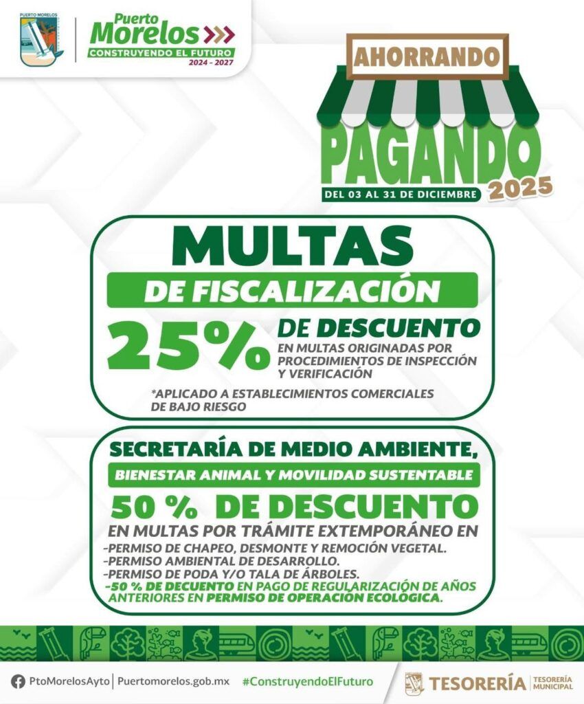 En trámites de la secretaria de Medio Ambiente, Bienestar Animal y Movilidad Sustentable, hay un 50% en multa por trámite extemporáneo en: Permiso de Chapeo y Desmonte y/o Remoción Vegetal; Permiso Ambiental de Desarrollo y Permiso de Poda y Tala. Asimismo, 50 por ciento en regularización de años anteriores por Permiso de Operación Ecológica.