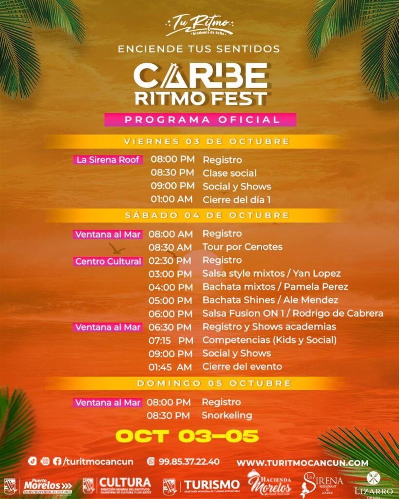Bajo el lema “Enciende tus Sentidos”, este viernes 3 de octubre, sábado 4 y domingo 5 se llevará a cabo el “Caribe Ritmo Fest”, espectáculo con el que se abrirá espacio a la cultura y baile con la participación de academias del municipio, Playa del Carmen, Cancún e Isla Mujeres, informó la directora del Instituto Municipal de Cultura y las Artes, Adriana Nava Gómez.