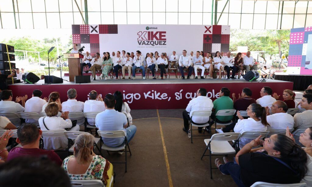 La presidenta municipal Blanca Merari Tziu Muñoz felicitó hoy al diputado federal Enrique Vázquez Navarro, quien rindió su Primer Informe de labor legislativa en el Domo “Dos Aguas”, aledaño al Palacio Municipal.