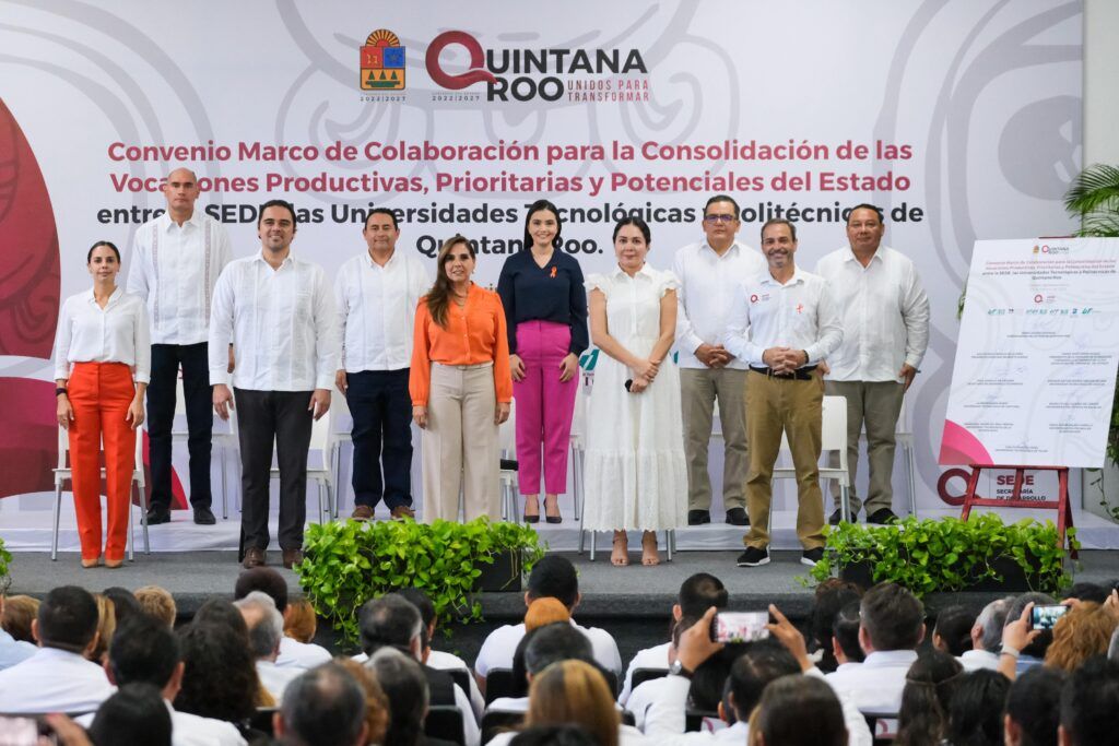 En beneficio directo de más de 5 mil 500 alumnas y alumnos de las 6 universidades tecnológicas y politécnicas del estado, la gobernadora Mara Lezama Espinosa atestiguó la firma de un convenio de colaboración entre la Secretaría de Desarrollo Económico (SEDE) y las universidades, lo que permitirá promover el desarrollo económico y profesional.