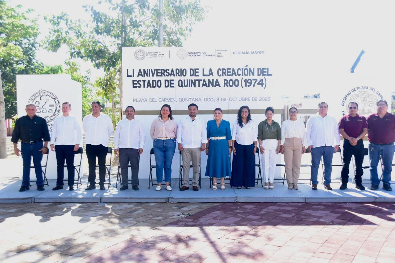 Con un acto cívico realizado en la Plaza 28 de Julio, el Ayuntamiento de Playa del Carmen conmemoró el 51 aniversario de la creación del Estado de Quintana Roo, resaltando la historia, fortaleza y desarrollo que han distinguido a la entidad a lo largo de más de cinco décadas.