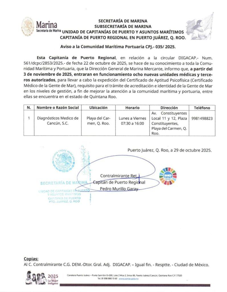 El aviso fue firmado por el Contralmirante Retirado Pedro Murillo Garay, Capitán de Puerto Regional en Puerto Juárez.