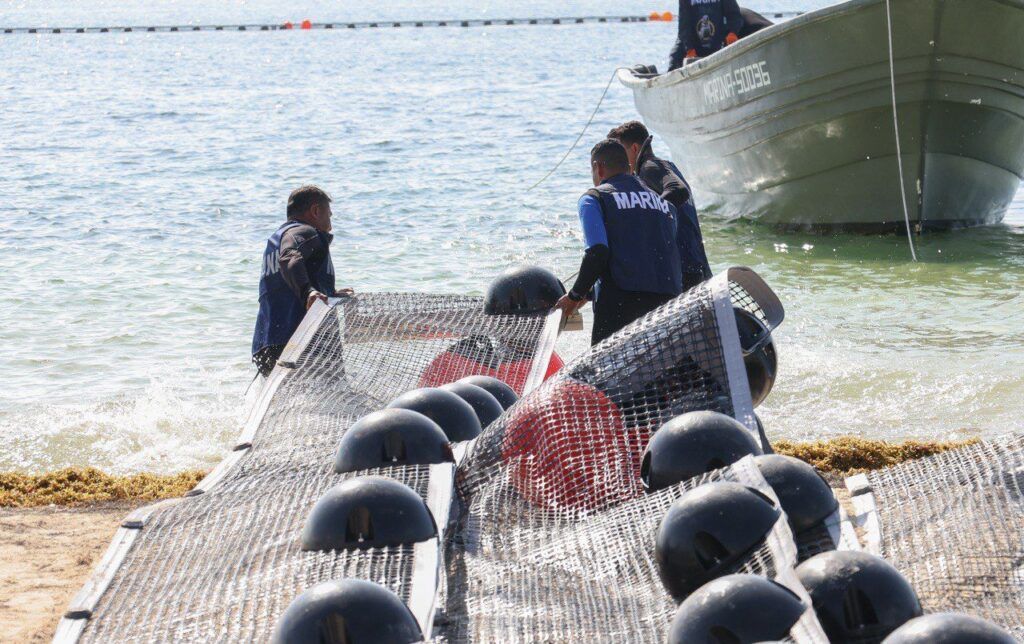 En la fase de contención se instalan barreras en sitios estratégicos para contener el alga y redireccionarlo hacia los puntos de recolección. Ya se han instalado 9 mil 500 metros de barrera.