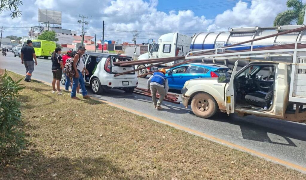 Un aparatoso accidente registrado la tarde de este jueves en el cruce de la avenida José López Portillo con Nichupté generó movilización de cuerpos de emergencia y reavivó la preocupación sobre el traslado seguro de materiales en la ciudad.