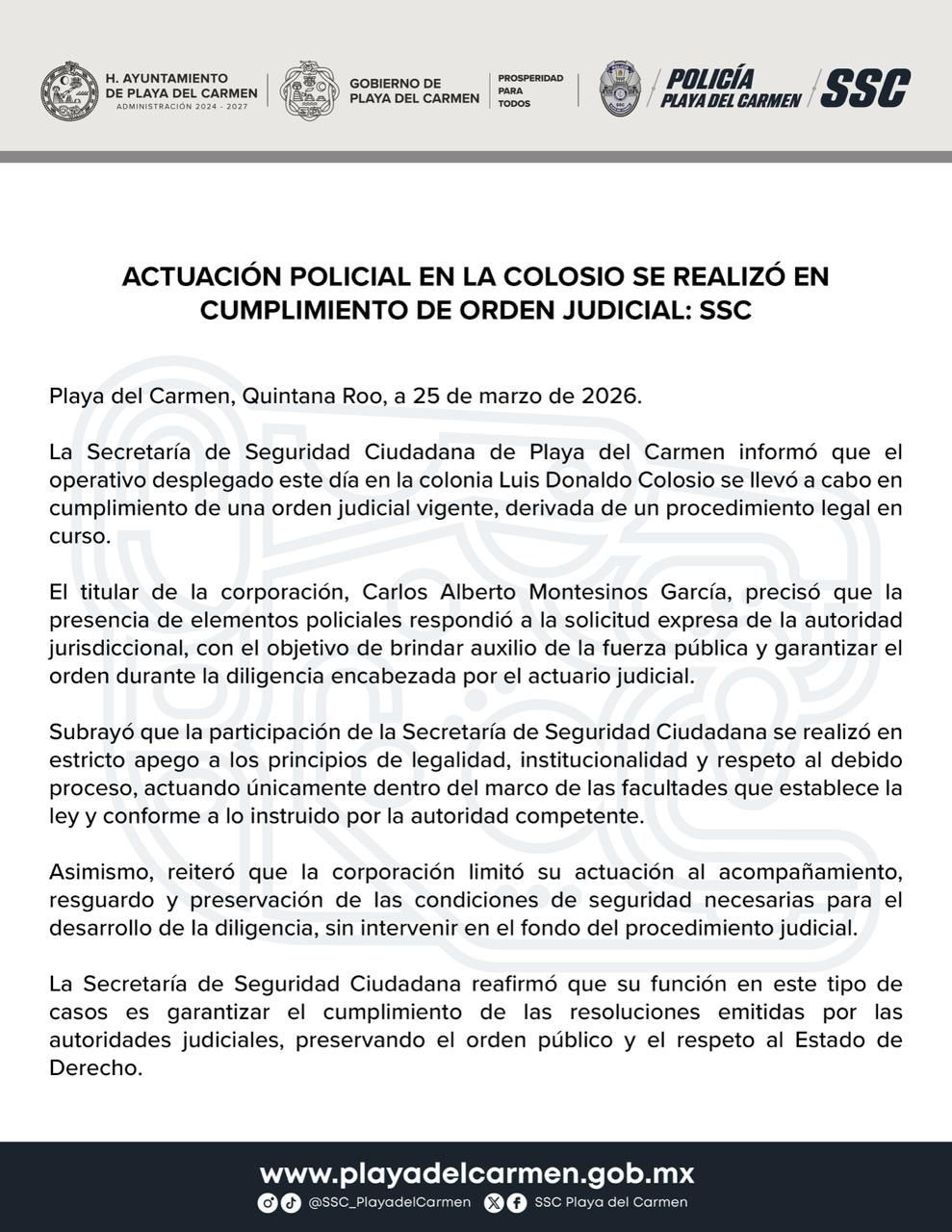 La Secretaría de Seguridad Ciudadana de Playa del Carmen informó que el operativo desplegado este día en la colonia Luis Donaldo Colosio se llevó a cabo en cumplimiento de una orden judicial vigente, derivada de un procedimiento legal en curso.