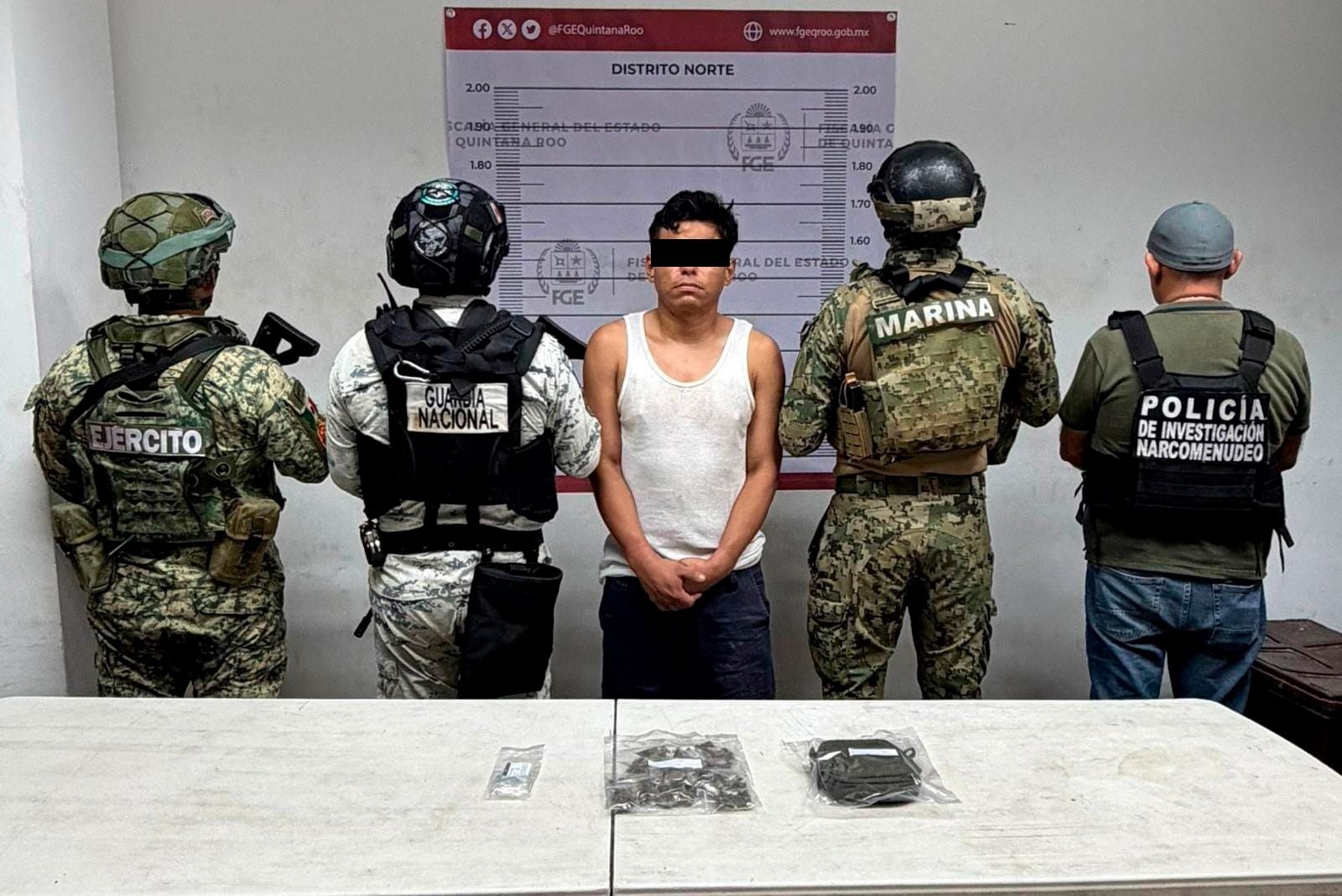 En Benito Juárez, en un inmueble de la colonia Rancho Viejo, los elementos participantes aseguraron hierba verde seca y fragmentos sólidos blancos; asimismo, fue detenido Manuel “N”, señalado como presunto distribuidor de droga en el lugar.