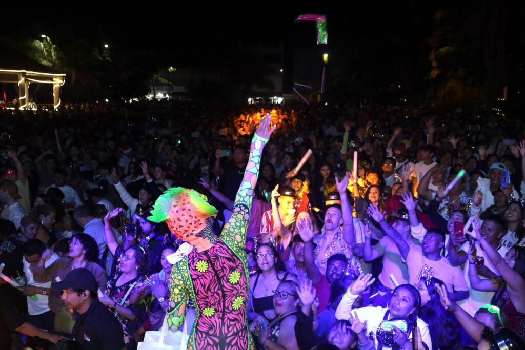 Desde las 19:00 horas y hasta la 01:00 de la madrugada, el icónico Portal Maya se convirtió en el eje de una experiencia audiovisual que fusionó elementos ancestrales con estética futurista, mediante un diseño integral de iluminación neón, pirotecnia fría y la participación de tres DJ’s de música electrónica, quienes condujeron la cuenta regresiva hacia el nuevo año.