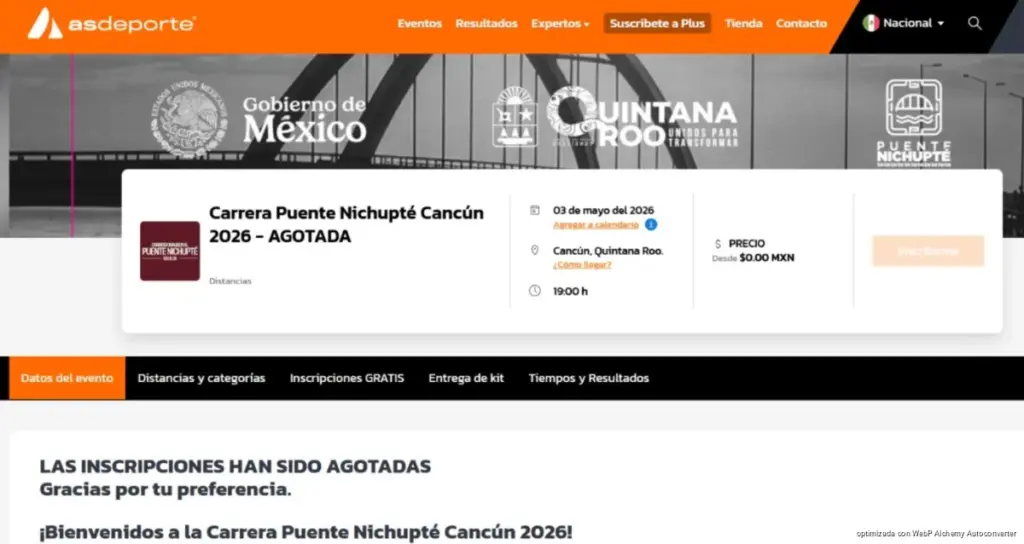 El evento, denominado Carrera Puente Nichupté Cancún 2026, contempla recorridos de 5 y 10 kilómetros sobre esta nueva vía, con salida y meta en el acceso Bonampak. La experiencia tendrá como distintivo el horario vespertino, permitiendo a los corredores atravesar el puente al atardecer.
