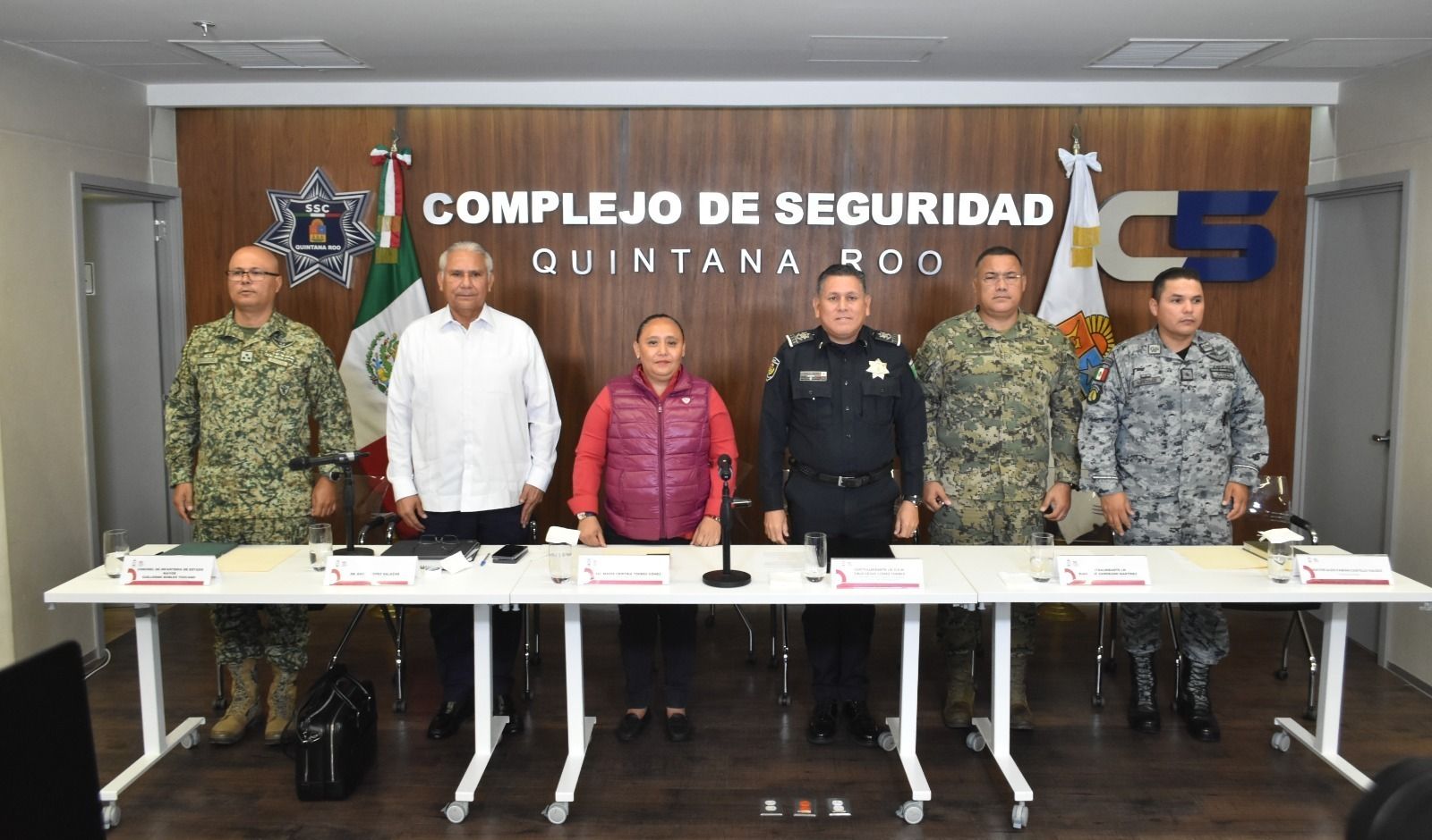 En la conferencia estuvieron presentes Cristina Torres Gómez, Secretaria de Gobierno; Contralmirante Julio César Gómez Torres, Secretario de Seguridad Ciudadana; Contralmirante Juan José Zamorano Martínez, Comandante de la Brigada de Infantería de Marina de la Quinta Región Naval; el Coronel de Infantería de Estado Mayor, Guillermo Robles Tozcano, Comandante del 64 Batallón de Infantería Puesto de Mando del Ejército Mexicano, y Mayor Fabián Castillo Valdés, de la Guardia Nacional.