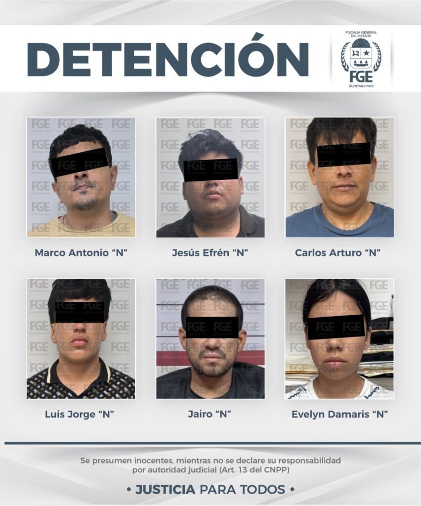 En una segunda acción, llevada a cabo en el fraccionamiento Jardines del Sur, los elementos policiales detuvieron en flagrancia a seis personas, entre ellas un adolescente; identificadas como Jesús Efrén “N”, alias “Chucho”; Carlos Arturo “N”; Luis Jorge “N”; Brenda “N”, así como Jorge y/o Jairo “N”, quien presenta lesiones relacionadas con un ataque a un bar, ocurrido el 29 de marzo del presente año.