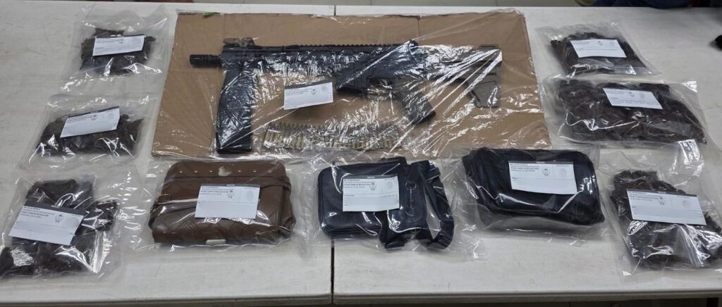 Tras una inspección, se le aseguraron dosis de vegetal verde seca con características de la marihuana, así como un arma de fuego larga, calibre .223, con cargadores abastecidos, un arma de fuego hechiza, cartuchos útiles y un vehículo marca Nissan, tipo Sentra.