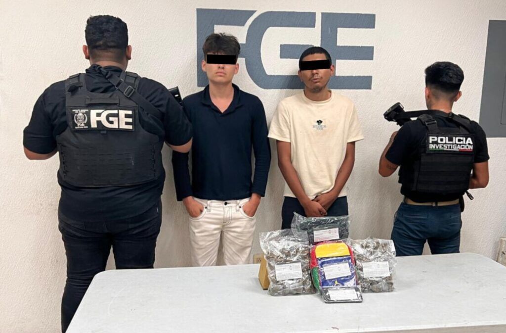 En una segunda intervención, elementos de la Policía de Investigación detuvieron en flagrancia a Carlo Tahir “N” y Joaquín Antonio “N” en la avenida CTM, entre las avenidas Azulejos y Periférico, del fraccionamiento Villas del Sol. Los agentes observaron un intercambio de presuntos narcóticos, por lo que les practicaron una inspección, les aseguraron una bolsa de mano, una cangurera color azul, hierba seca y verde similar a la marihuana y un teléfono celular.