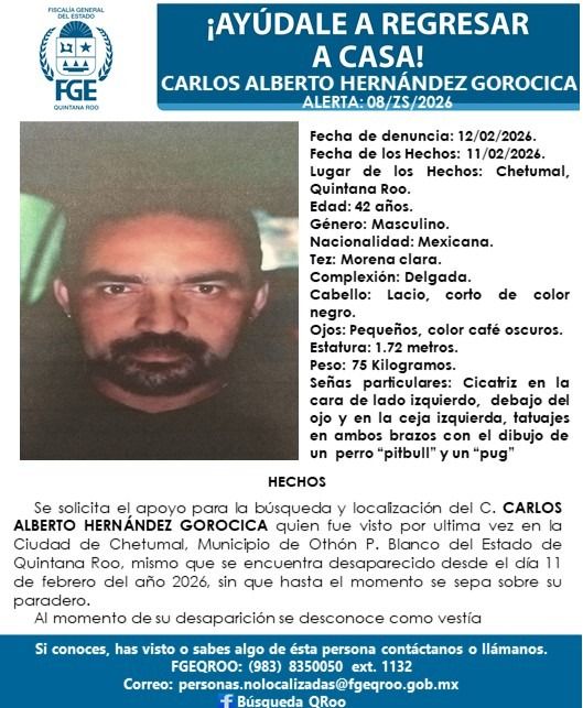 De acuerdo con información oficial, el hombre había sido visto por última vez días antes en Chetumal y existía una alerta de búsqueda vigente.