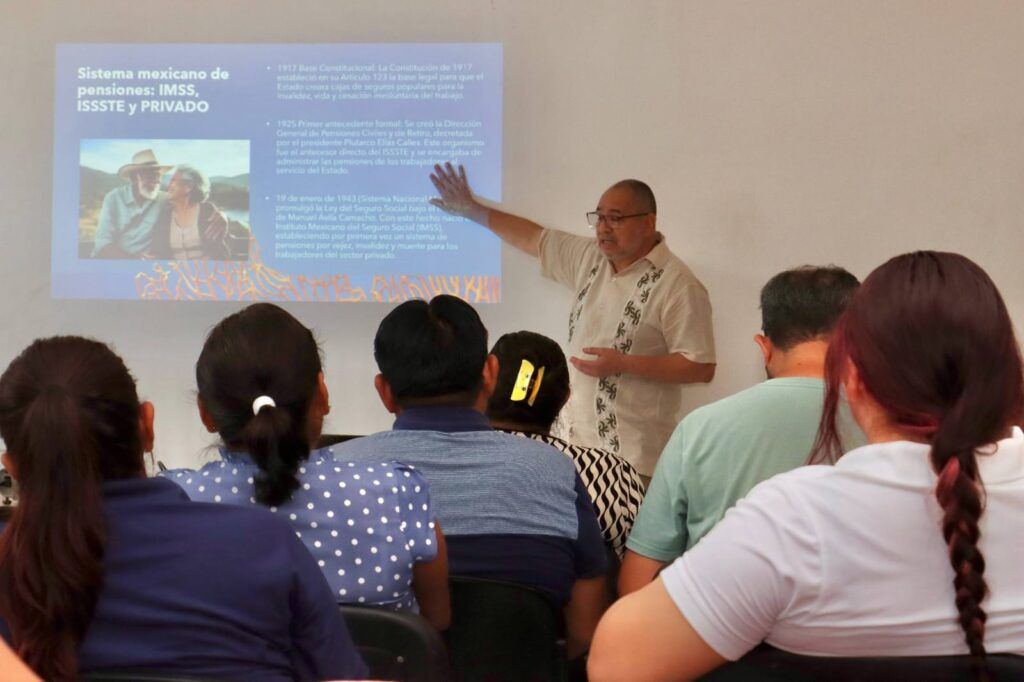 La jornada de formación estuvo a cargo del asesor Iván Esquível Molina, representante de GMX Seguros, quien desarrolló una exposición técnica y práctica sobre el Sistema Mexicano de Pensiones, abordando las diferencias entre jubilación y pensión, así como las características del régimen del IMSS, ISSSTE y el sistema privado.