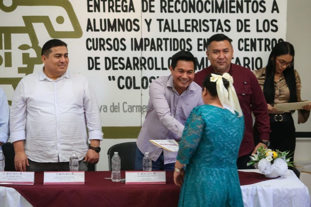 En representación de la presidenta municipal Estefanía Mercado, el síndico municipal del Ayuntamiento, Agustín Aguilar Méndez, encabezó la ceremonia de entrega de reconocimientos a 145 alumnas, alumnos y 12 talleristas que concluyeron satisfactoriamente diversos cursos de capacitación impartidos en los Centros de Desarrollo Comunitario de las colonias Luis Donaldo Colosio y Zazil-Ha.