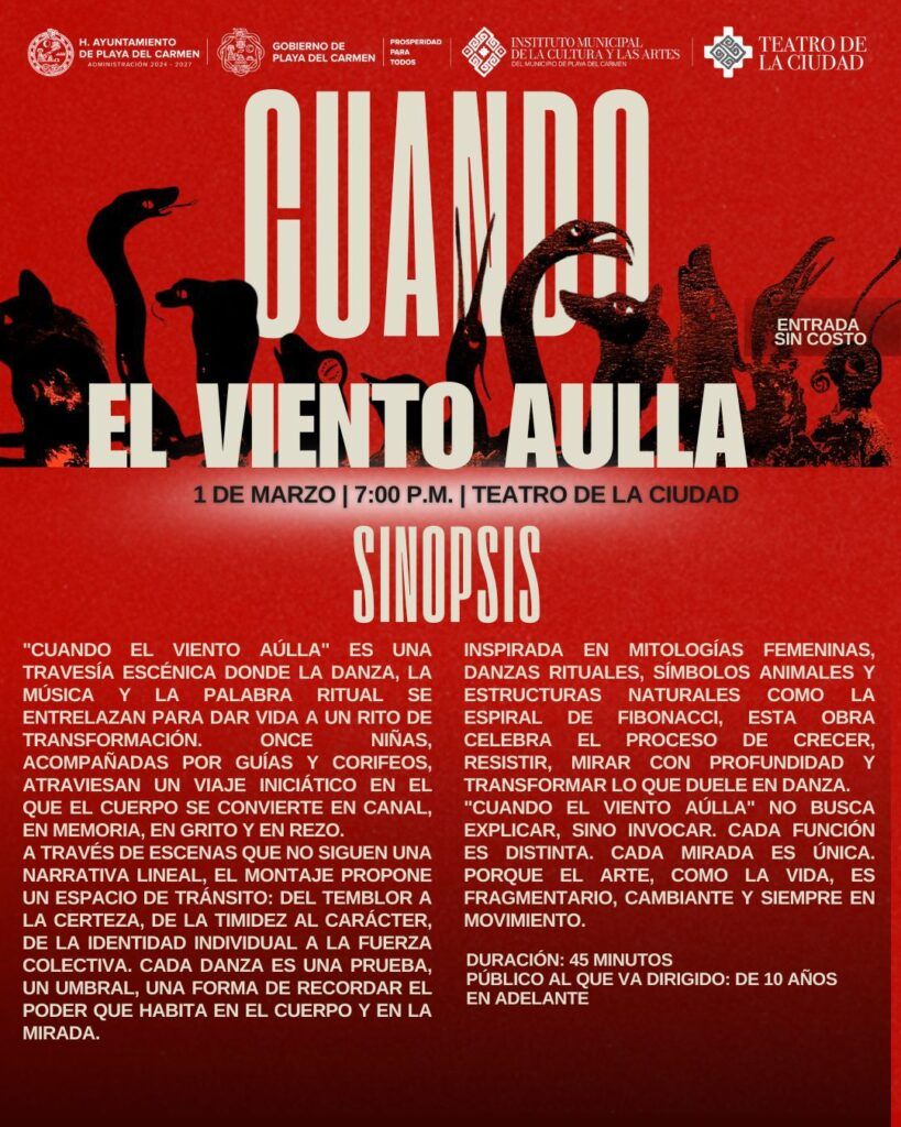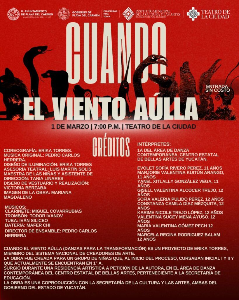 El Teatro de la Ciudad recibirá, el domingo 1 de marzo a las 19:00 horas a Erika Torres (Homenaje a Lorca y de Falla en enero 2025), ahora con la obra “Cuando el viento aúlla. Danza para la transformación”, en la que participan 10 niñas de entre 10 y 14 años.