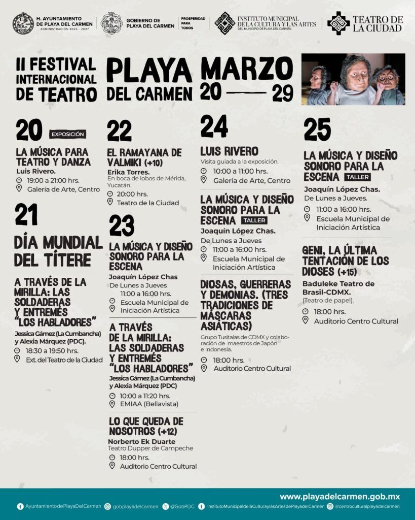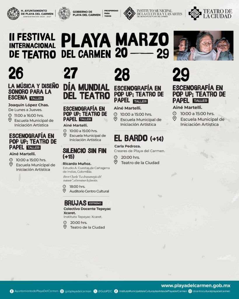 “Invitamos a la comunidad artística playense, cuyos creadores tendrán presencia con agrupaciones como el Colegio Tepeyac y el grupo Creares, a sumarse a los cursos y charlas impartidos por especialistas en teatro de papel, actuación y música aplicada a la escena”, expresó.