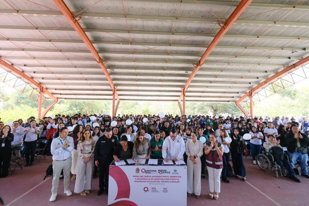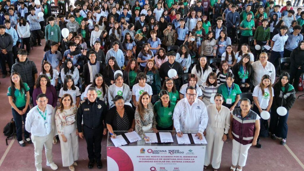 La gobernadora Mara Lezama Espinosa encabezó la firma del Nuevo Acuerdo del Bienestar para fortalecer la seguridad escolar en el sistema CONALEP, en un acto que calificó como histórico al garantizar el derecho de las y los estudiantes a formarse en entornos seguros y en paz.