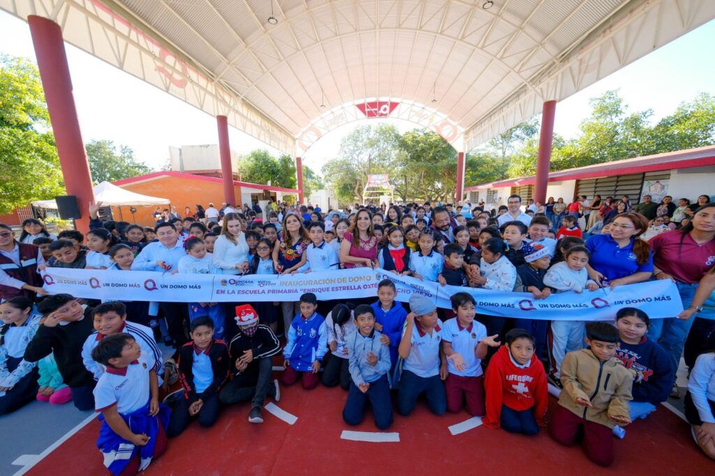 Acompañada de la presidenta municipal de Isla Mujeres, Atenea Gómez Ricalde, y de la presidenta honoraria del DIF Quintana Roo, Verónica Lezama, la titular del Ejecutivo recordó que este domo forma parte de un proyecto de mil 109 en todo el estado, que representa una estrategia para cerrar brechas de desigualdad en las escuelas de la entidad.