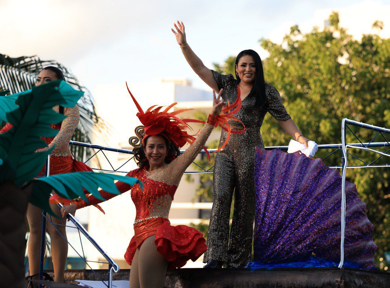La presidenta municipal Blanca Merari Tziu Muñoz encabezó el recorrido en un carro alegórico alusivo a la belleza del mar de este rincón caribeño, seguido por el carro con el Faro Inclinado símbolo de fortaleza y resiliencia de las y los portomorelenses, en el marco del 10º Aniversario del municipio.