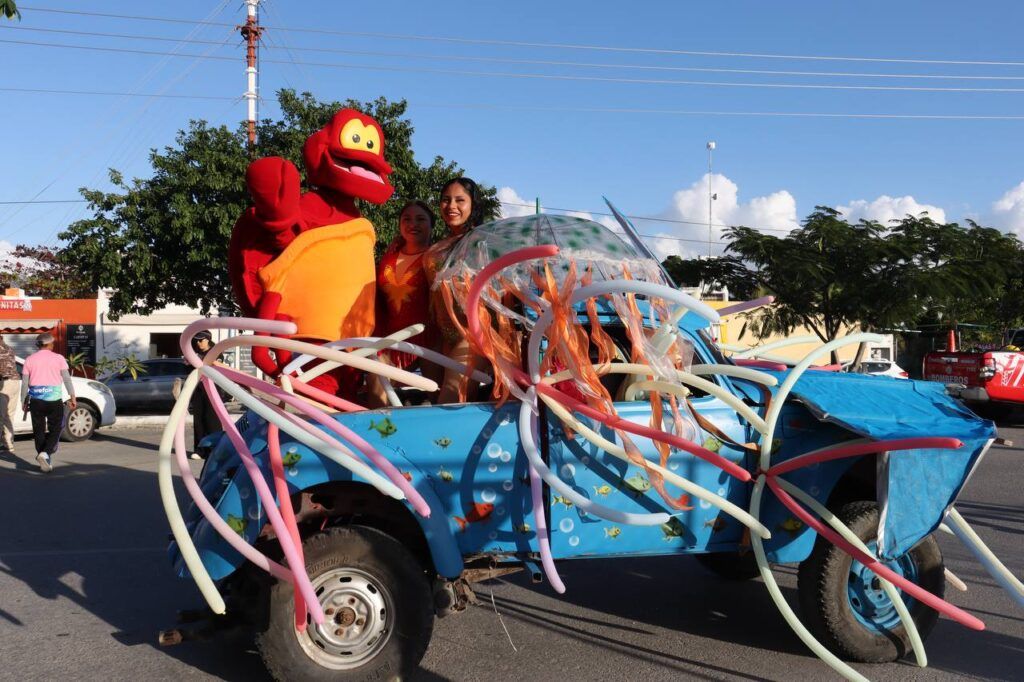 En el desfile participaron 24 carros alegóricos, tanto de concursantes como de dependencias municipales, y del club de autos que destacaron por sus temáticas marinas y mayas, envolviendo a las familias en un ambiente de tradición y alegría.