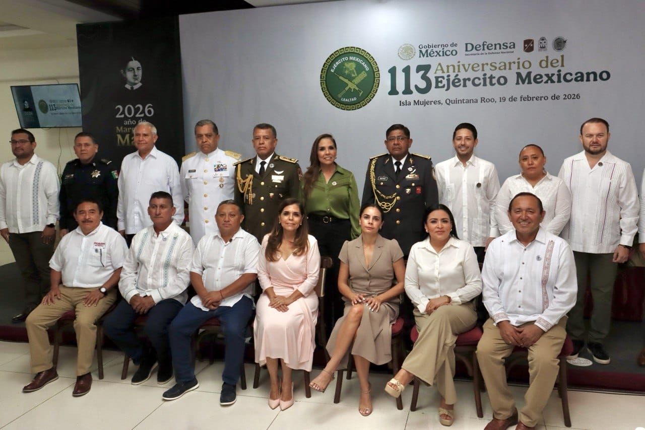 En el marco del 113 aniversario de la creación del Ejército Mexicano, la presidenta municipal de Puerto Morelos, Blanca Merari Tziu Muñoz, asistió al desayuno conmemorativo organizado por autoridades castrenses, llevado a cabo en las instalaciones de la Guardia Nacional en el municipio de Isla Mujeres, acto encabezado por la gobernadora Mara Lezama.