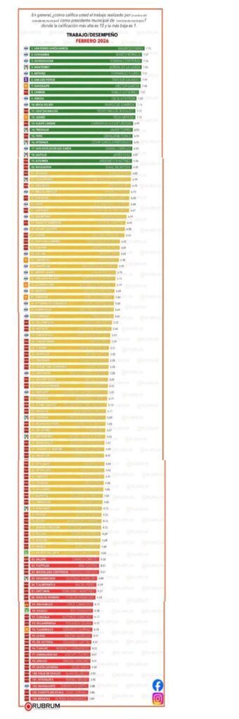 La empresa Rubrum, con amplia experiencia en materia política-electoral, publicidad y comunicaciones, presentó hoy las nuevas calificaciones que dieron los ciudadanos al desempeño de los alcaldes en 104 municipios de todo México, donde están incluidos las alcaldesas de Othón P. Blanco, Yensunni Idlia Martínez Hernández; Playa del Carmen, Angy Estefanía Mercado Asencio y; la de Benito Juárez, Ana Patricia Peralta de la Peña.